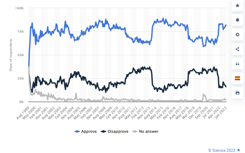 Del mismo modo y siguiendo con el mismo Centro de Análisis se puede constatar que el presidente Putin sigue contando con un elevado nivel de popularidad. En enero de 2023 el 82% apoyaba su gestión, teniendo tan sólo en contra a un 16% (el 2% no contestó). Nótese el descenso de popularidad, a un 77%, tras el anuncio de movilización parcial de septiembre de 2022. En todo caso la popularidad del presidente no ha descendido del 71% desde que comenzó la invasión de Ucrania.