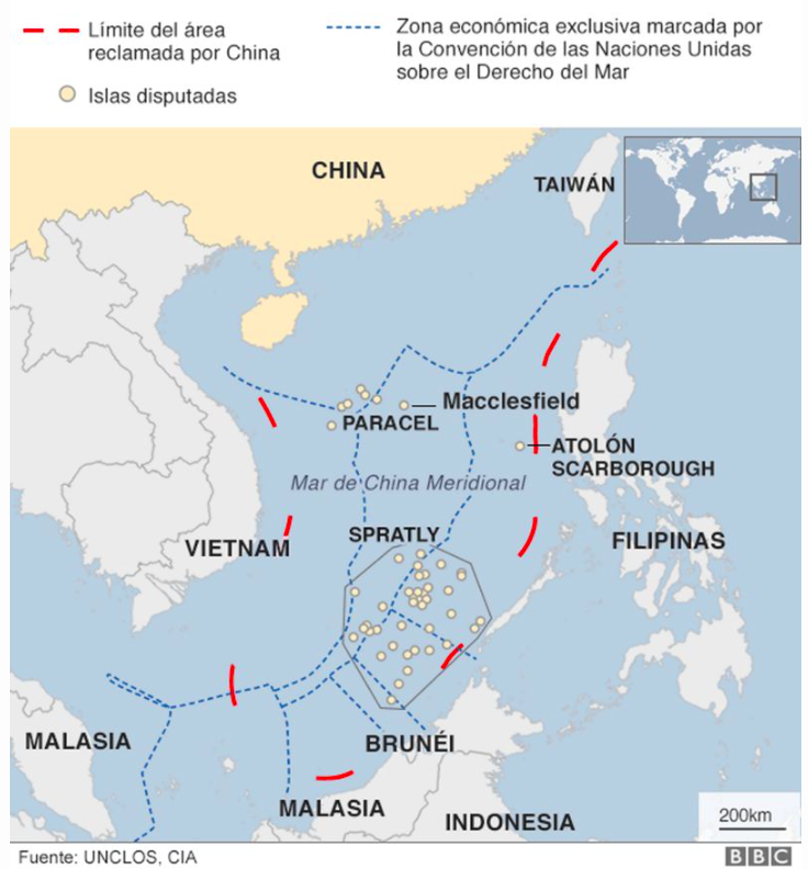 El Mar Meridional de China: Otro asunto espinoso es la expansión de la RPC en el Mar del Sur de China, “su Mare Nostrum”, que Pekín reclama como propio casi en su totalidad. Durante la presidencia de Xi Jinping se han construido en las islas Paracel y Spratly y en otras islas y arrecifes artificiales ciudades, puertos, pistas de aterrizaje o instalaciones militares, con el objetivo de ampliar su Zona Económica Exclusiva (ZEE). A ello se oponen Filipinas, Vietnam, Taiwán, Malasia y Brunéi, países que verían mermada su propia ZEE, zona por la que transitan las rutas comerciales y energéticas que, según La Conferencia de las Naciones Unidas sobre Comercio y Desarrollo (UNCTAD), representan un tercio del transporte marítimo mundial.