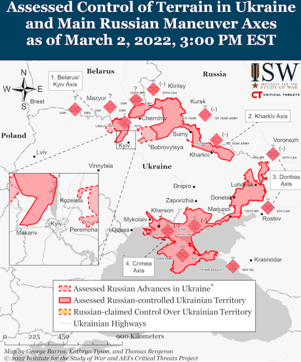 El primer eje de ataque fue desde el norte para llegar a la capital desde ambas orillas del Dnieper, lo que implicó dos esfuerzos de progresión. La finalidad era alcanzar lo antes posible la capital y tomarla para derrocar al gobierno, uno de los objetivos estratégicos establecidos por el presidente Putin. Si Kiev hubiese caído en las primeras horas o días la voluntad de resistencia de las fuerzas ucranianas, muy probablemente, se habría desmoronado. Pero no fue así. A día de hoy los combates se mantienen en los alrededores de la capital y se cree que el cerco a la misma no se habría aún completado, a pesar de que se han aumentado considerablemente las fuerzas que se han sumado a este esfuerzo, recibiendo también apoyo desde el eje de Járkov. Además, se ha encontrado una fuerte resistencia en la ciudad de Chernigov, camino de la capital, que ha dificultado la progresión sobre la orilla oriental del Dnieper.