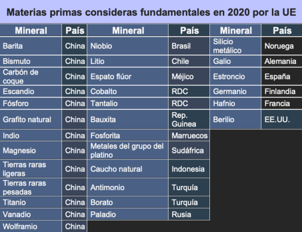 La UE ha elaborado una lista con los minerales y tierras raras que considera que serán de elevada importancia en los próximos años, y que recoge el informe titulado Communication from the Commission to the European Parliament, the Council, the European Economic and Social Committee and the Committee of the Regions Critical Raw Materials Resilience: Charting a Path towards Greater Security and Sustainability; los materiales son los que se incluyen en la lista abajo reflejada con dichos materiales, siendo necesaria la importación de la mayoría de ellos, por lo que la dependencia de la Unión en este campo que se será vital es otro factor de fragilidad económica y productiva para la UE.